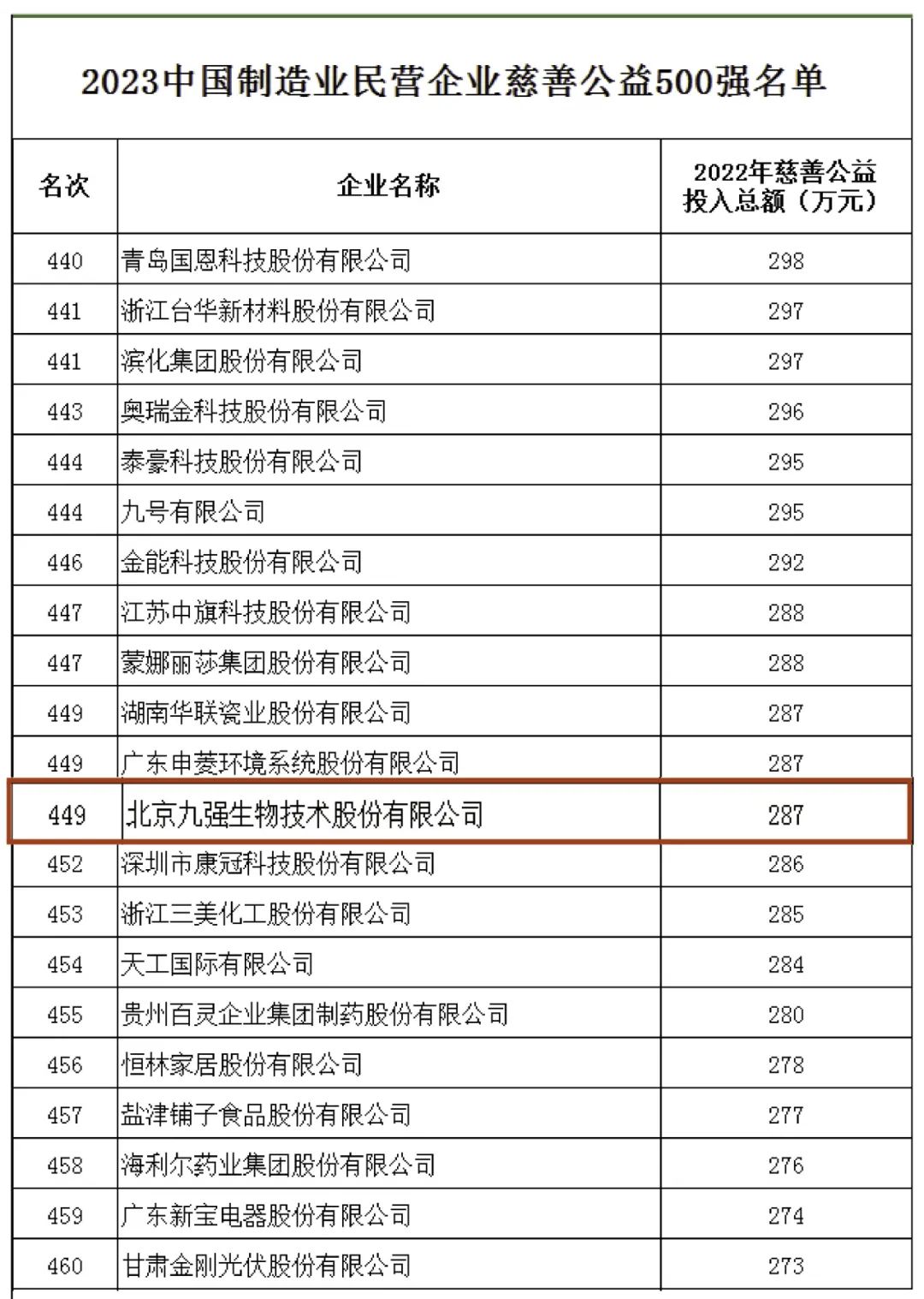 以业载善,以善兴业。作为中国领先的临床体外诊断产品与服务供应商之一,近年来九强生物在推动企业持续高质量发展的同时,积极投身社会公益活动。此次荣获“2023中国企业慈善公益500强”再次彰显了民营企业的社会责任与担当。未来,九强生物将继续发扬优良传统,持续加大慈善公益事业投入,真诚回馈社会,用爱心行动和公益善举为社会创造更多美好价值,为推动经济社会高质量发展和全体人民共同富裕的中国式现代化建设积极做出更大的贡献。