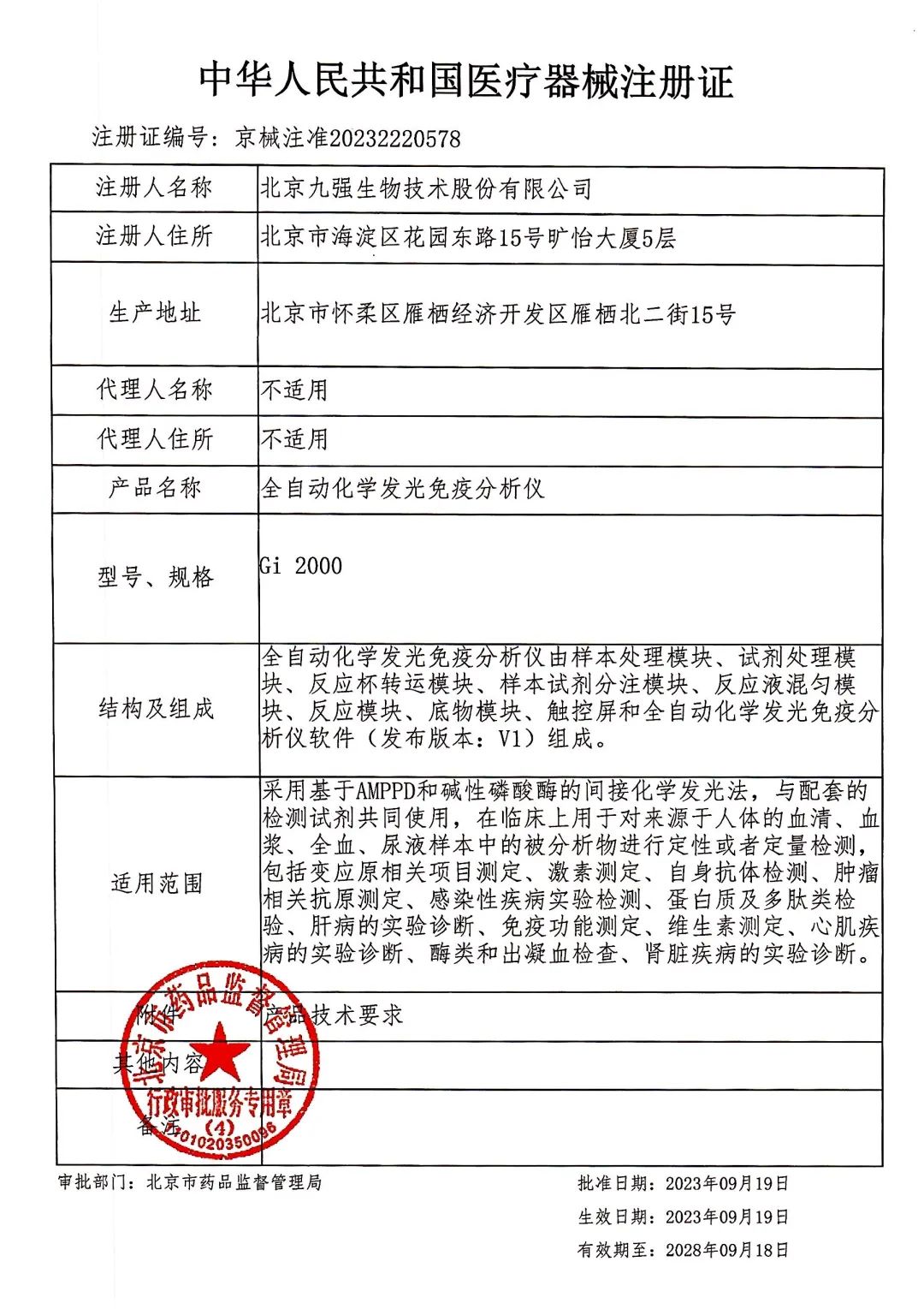 九强生物Gi1600全自动化学发光免疫分析仪和Gi2000全自动化学发光免疫分析仪顺利获得北京医疗器械监督管理局颁发的《医疗器械注册证》,注册证号分别为京械注准20232220577、京械注准20232220578。