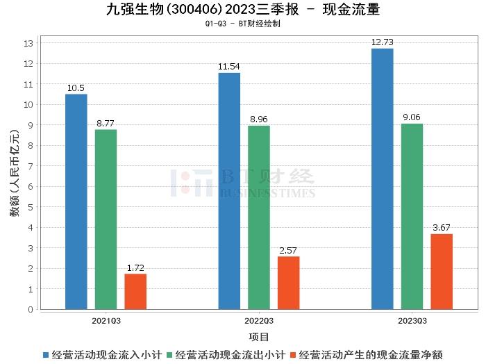 在现金流量方面,九强生物公司的经营活动产生的现金流量净额从上年同期的2.57亿元增长到年初至本报告期末的3.67亿元,增长了42.54%。经营活动现金流入小计从上年同期的11.54亿元增长到年初至本报告期末的12.73亿元,增长了10.32%。经营活动现金流出小计从上年同期的8.96亿元增长到年初至本报告期末的9.06亿元,增长了1.12%。这些数据显示,九强生物公司的现金流量状况良好。