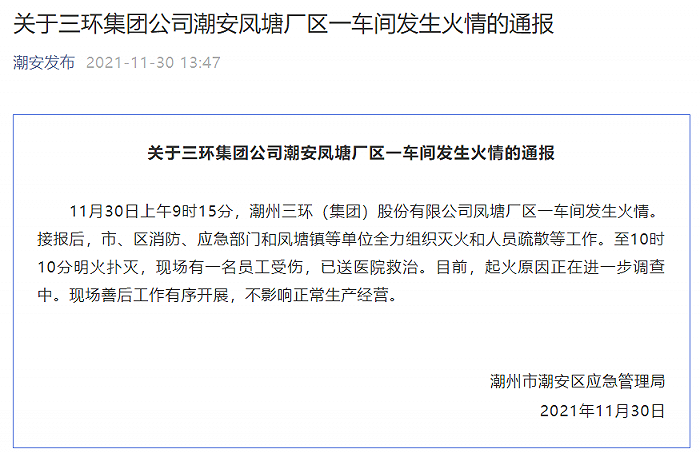据“潮安发布”消息,广东潮州市潮安区应急管理局通报,11月30日上午9时15分,潮州三环(集团)股份有限公司凤塘厂区一车间发生火情。接报后,市、区消防、应急部门和凤塘镇等单位全力组织灭火和人员疏散等工作。至10时10分明火扑灭,现场有一名员工受伤,已送医院救治。目前,起火原因正在进一步调查中。现场善后工作有序开展,不影响正常生产经营。
