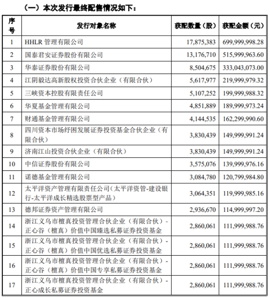 据2021年12月15日发布的上市公告书,三环集团此次定增的发行对象共有20家。