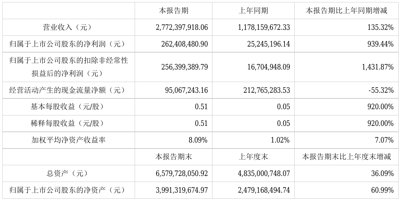 8月26日,道氏技术(300409)近日发布2021年半年度报告,报告期内营业收入2,772,397,918.06元,同比增加135.32%;净利262,408,480.90元,同比净利增加939.44%。