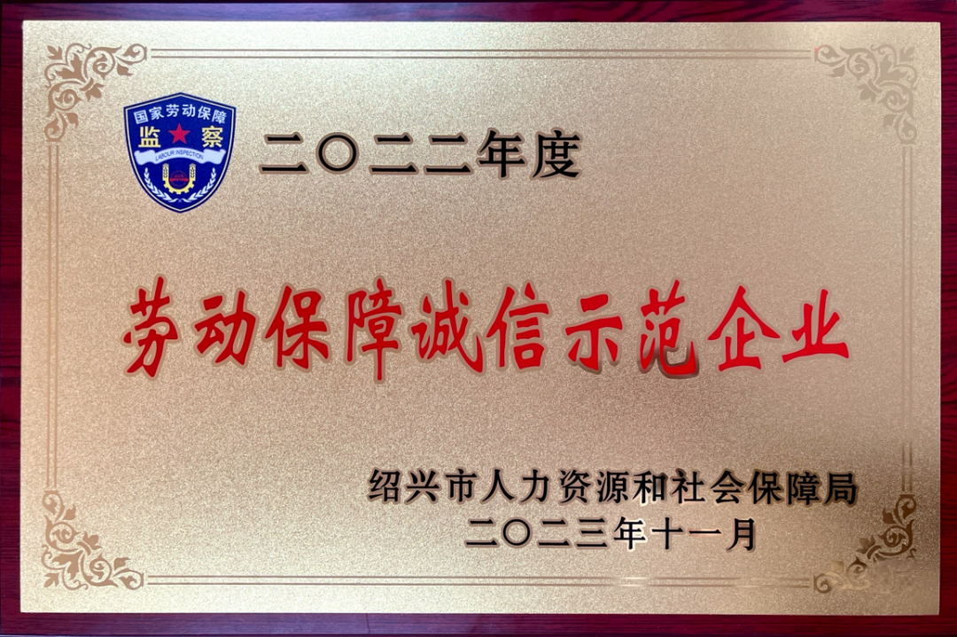 11月28日,绍兴市人力资源和社会保障局举行2022年度劳动保障诚信示范企业代表授牌表彰仪式,金盾股份荣获“2022年度劳动保障诚信示范企业”称号。