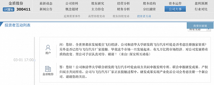 此前金盾股份在互动平台上称,公司和清华大学联合研发的飞行汽车叶轮由双方共同申报发明专利,联合申报研发成果,产权归双方共同所有。