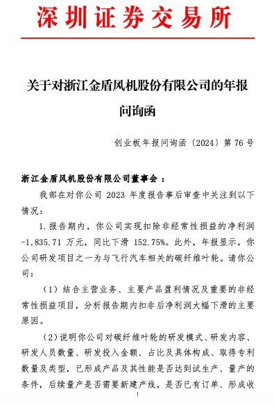 1.报告期内,金盾股份实现扣除非经常性损益的净利润-1,835.71万元,同比下滑152.75%。此外,年报显示,金盾股份研发项目之一为与飞行汽车相关的碳纤维叶轮。请金盾股份: