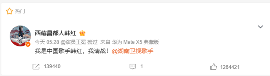 歌手霸榜韩红请战