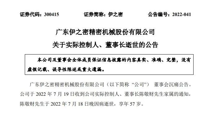 世事无常,这是让人悲伤而无奈的铁律。对深沪两市近4800家上市公司来说,同样概莫能外。广东伊之密(300415)7月19日午间发布公告称,公司实际控制人、董事长陈敬财于2022年7月18日晚因病逝世,享年57岁。