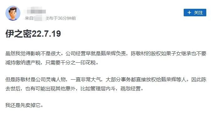 回到伊之密,市场人士认为,陈敬财作为实控人、董事长,他的逝世对公司的影响将会持续一段时间。具体到持股股民方面,记者留意到,有网友发帖指出,陈敬财作为公司灵魂人物,在他之后公司管理层可能有所波动,因此选择先卖出。