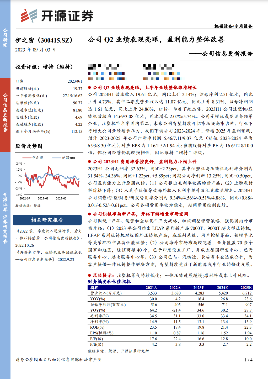 答:注塑机业务方面,2020年,2021年行业景气度良好,公司的毛利率水平较高。从2021年下半年开始,注塑机国内市场需求从火爆逐渐转向平稳。2022年注塑机行业景气度同比有所下滑,但公司仍保持着不错的发展势头。2023 年上半年,注塑机行业景气度有所回升,注塑机需求较为稳定,公司注塑机产品的销售收入同比有所上涨,优于行业整体水平。另外,由于汽车行业特别是新能源汽车的快速发展,公司二板机产品销售情况较为良好,全电动注塑机继续保持快速增长态势。注塑机应用场景广泛,公司看好注塑机市场的持续向好发展。公司会继续加大对汽车等重点行业的深度开发,积极把握新的市场机遇,更好的满足行业及客户新的需求。