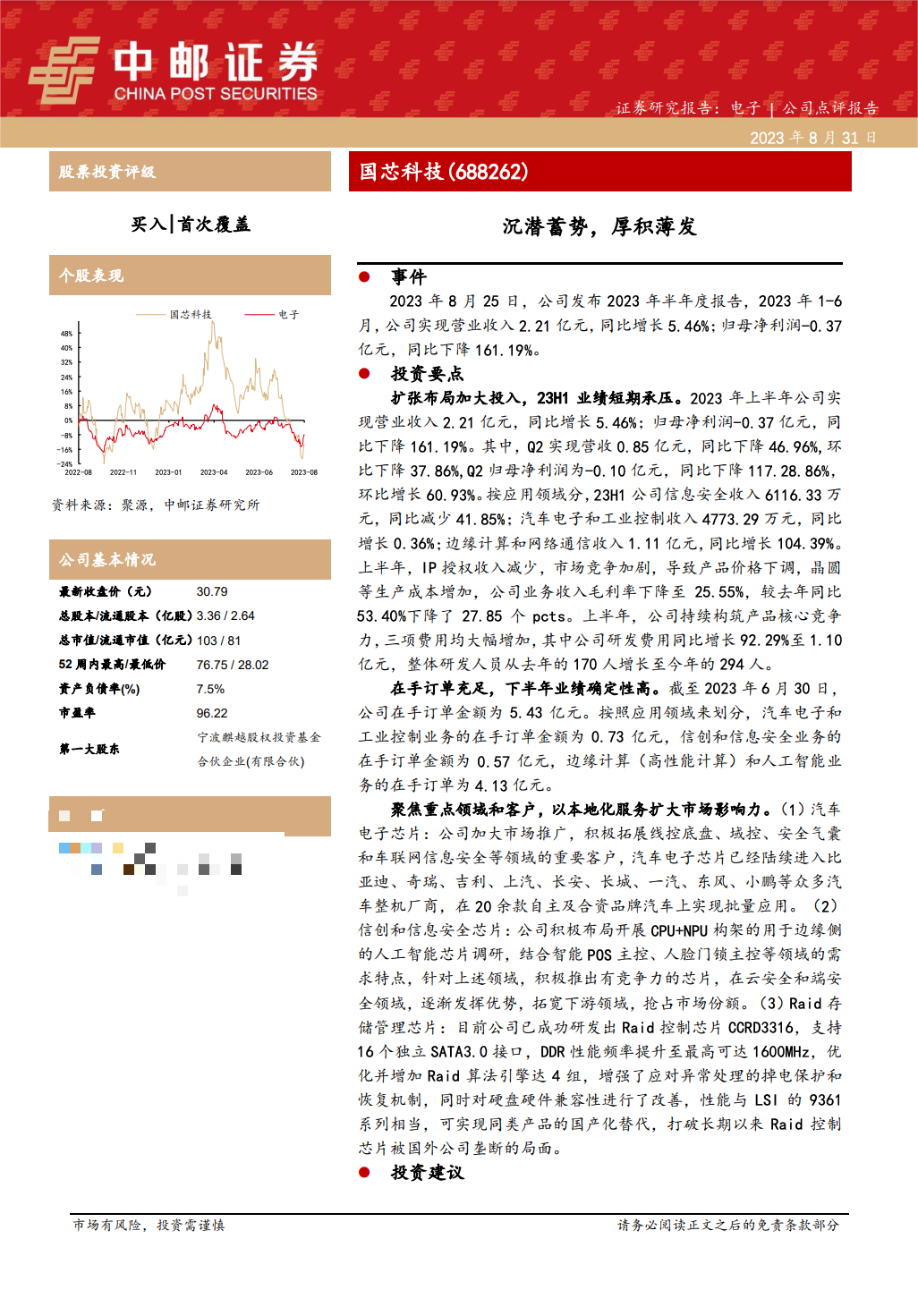 高性能边缘计算、安全和网络通信集成处理控制器芯片H2040,基于28nm工艺设计,采用国芯32位四核的PowerPC指令架构CPU核,集成DDR3.0、PCIe3.0、千兆网、SATA2.0、RapidIO2.0等接口。高性能边缘计算、安全和网络通信集成处理控制芯片CCP1080T,基于14nm工艺设计,采用国芯64 位多核PowerPC 架构CPU核,集成高性能密码算法引擎、网络数据加速引擎等,具有万兆网、PCIe3.0、USB3.0等高速接口。上述二款芯片均已完成芯片测试,功能和性能指标满足设计需求,进入市场推广。