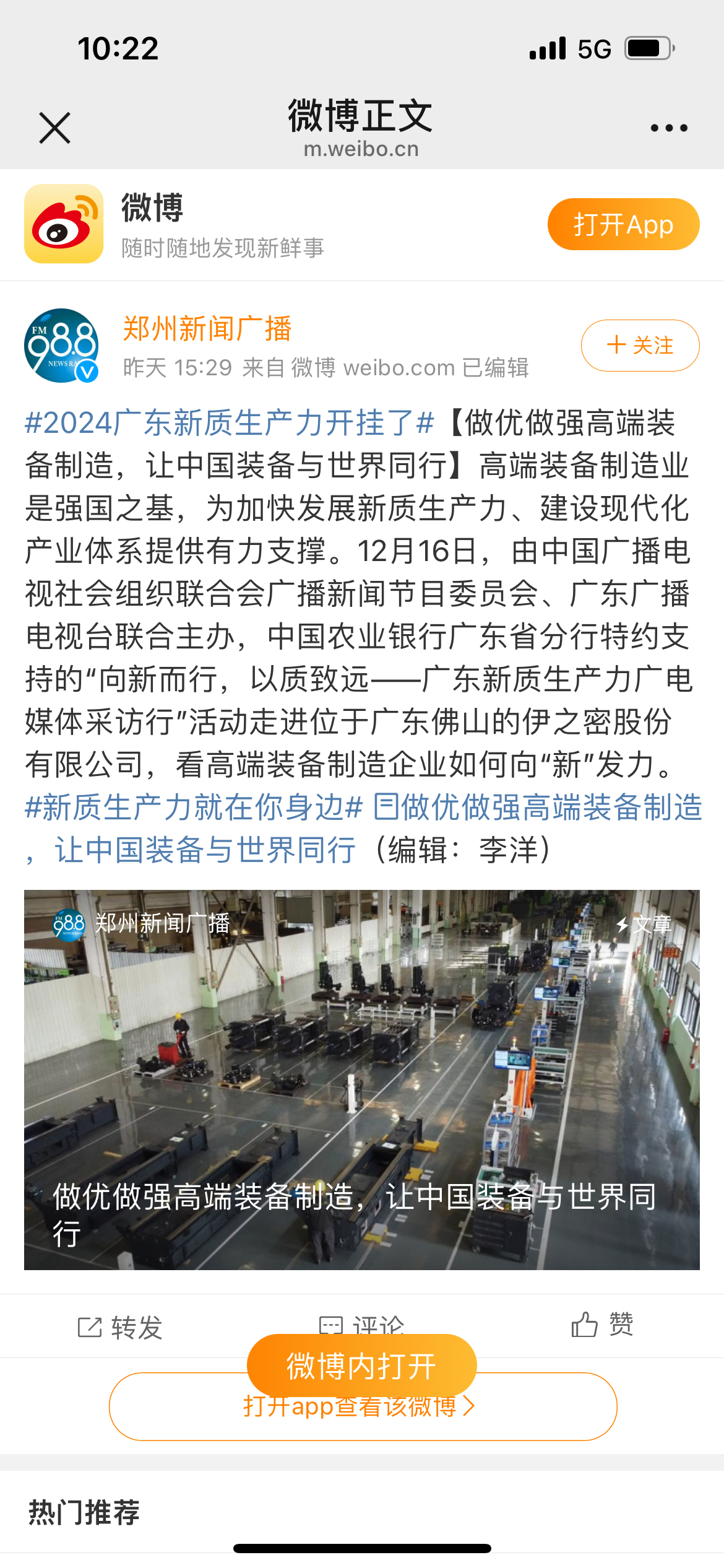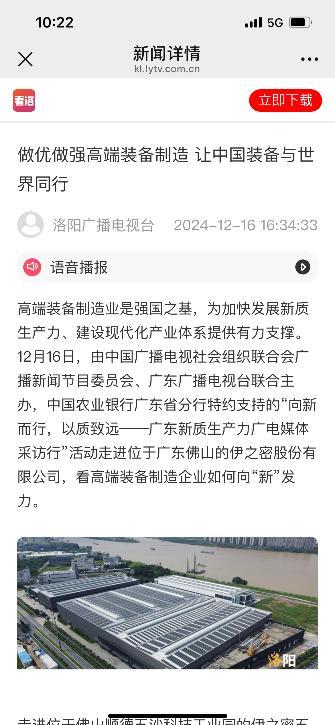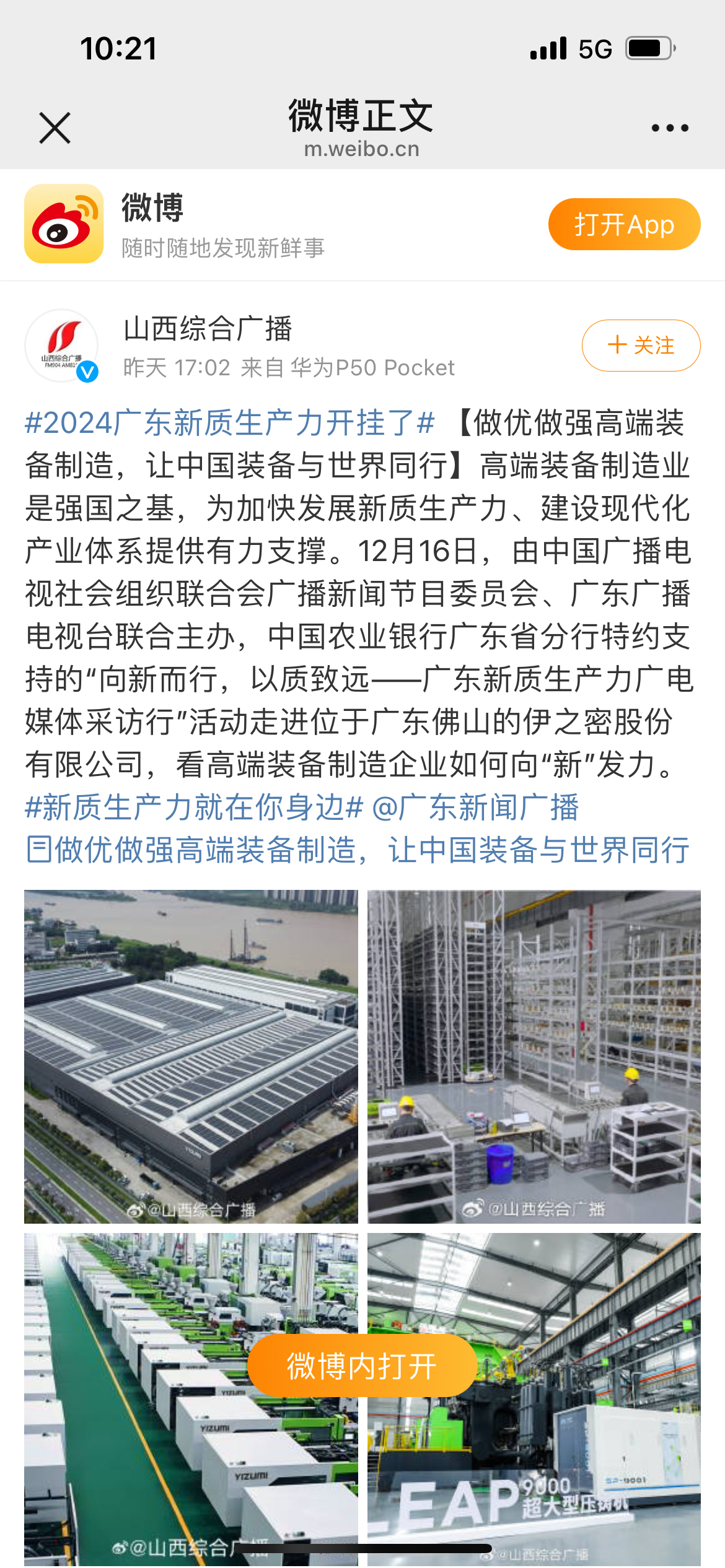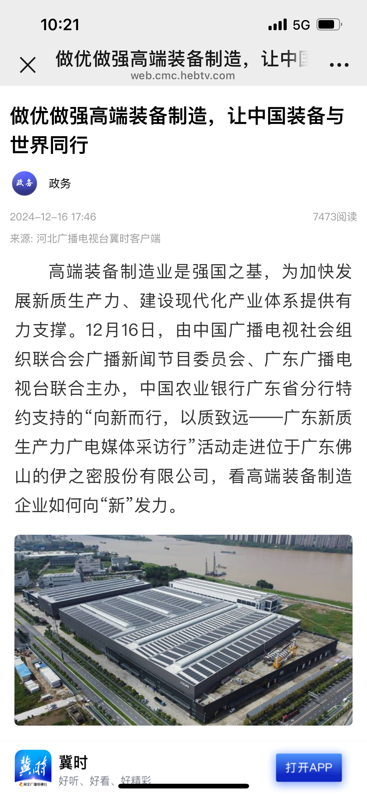 高端装备制造业是强国之基,为加快发展新质生产力、构建现代化产业体系提供有力支撑。12月16日,由中国广播电视社会组织联合会广播新闻节目委员会与广东广播电视台联合主办的“向新而行,以质致远——广东新质生产力广电媒体采访行”活动走进伊之密股份有限公司(以下简称:伊之密),探访高端装备制造企业如何向“新”发力。