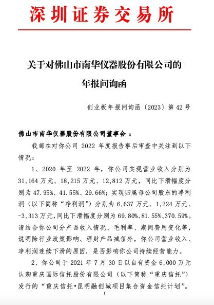 4月21日,佛山市南华仪器股份有限公司(以下简称“南华仪器”或“公司”)收到深圳证券交易所关于2022年年报的问询函。问询函要求南华仪器说明除行业政策影响、理财产品减值外,公司营业收入、净利润连续下滑的原因。