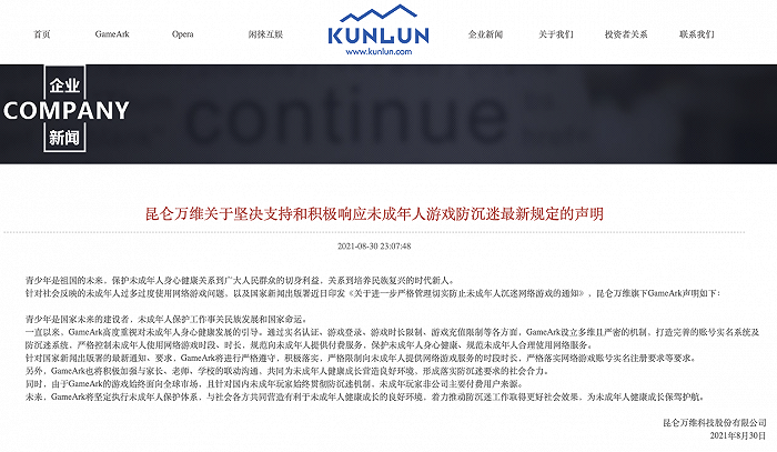 8月31日消息,昆仑万维官网30日晚间发布关于坚决支持和积极响应未成年人游戏防沉迷最新规定的声明:旗下GameArk将进行严格遵守,积极落实,严格限制向未成年人提供网络游戏服务的时段时长,严格落实网络游戏账号实名注册要求等要求。声明还称,由于GameArk的游戏始终面向全球市场,且针对国内未成年玩家始终贯彻防沉迷机制,未成年玩家非公司主要付费用户来源。