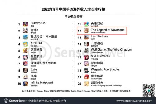 近日,全球领先的移动应用及手游情报平台Sensor Tower 发布了 2022 年 9 月中国手游产品在海外市场收入及下载量排行榜,昆仑万维(300418)旗下《The Legend of Neverland》(《圣境之塔》)入选2022年9月中国手游海外收入增长排行榜第 12 名,其他入围榜单的还包括海彼网络《Survivor.io》、米哈游《原神》等。
