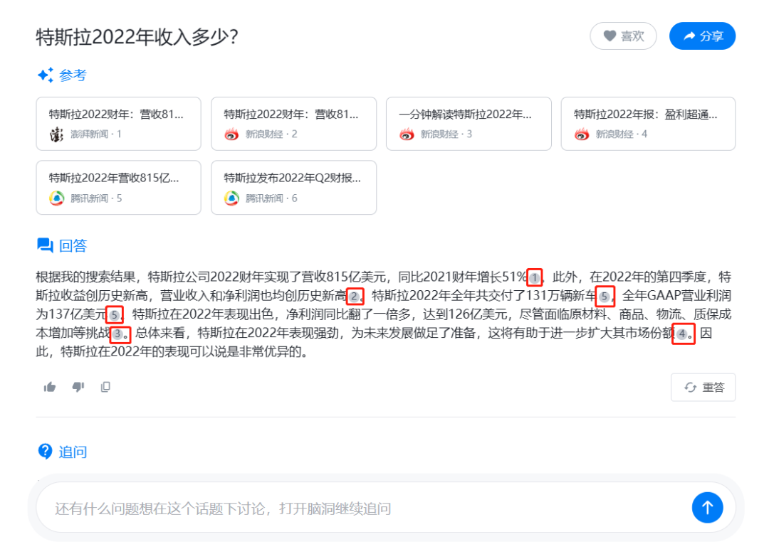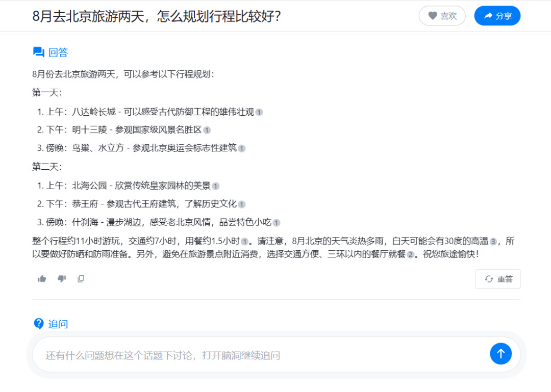 从鱼龙混杂,到可追溯可信赖。传统搜索的痛点之一,在于不同来源的海量信息带来的大量冗余和信息不一致;与此同时,大语言模型的生成机制,也无法完全规避“一本正经地胡说八道”现象。天工AI搜索在所有回答中加入了信源索引,以此保障答案可追溯、可考证、可信赖。同时,用户可将每轮次的搜索结果留存在天工内,便于随时查阅回溯,也可一键分享给他人。