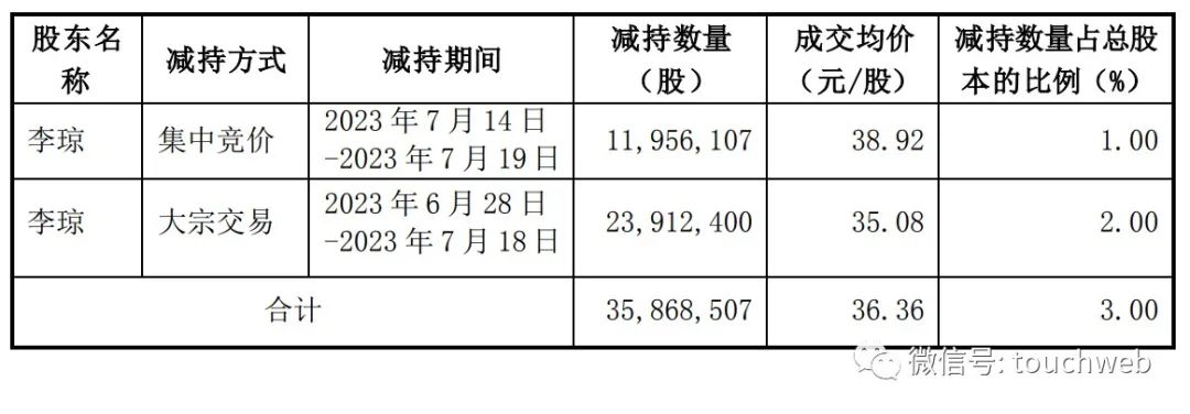 截止2023年7月19日,在本次减持计划期限内,李琼女士累计减持公司股份35,868,507股,其中通过集中竞价方式,合计减持公司股份11,956,107股,占公司总股本的1%,通过大宗交易方式,合计减持公司股份23,912,400股,占公司总股本的2%。