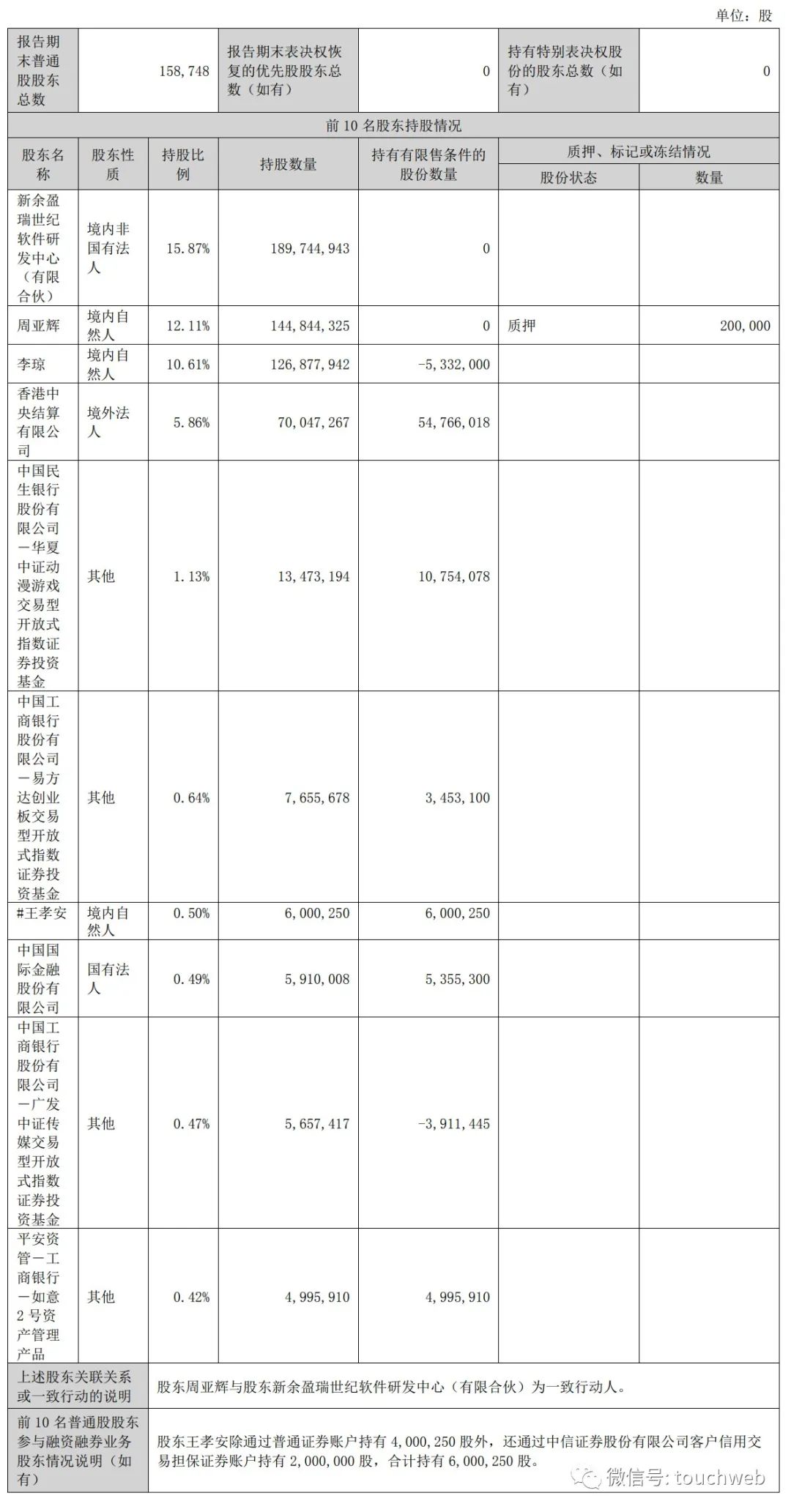 截至2023年6月30日,新余盈瑞世纪软件研发中心(有限合伙)持股为15.87%,周亚辉持股12.11%,李琼持股10.61%,香港中央结算有限公司持股为5.86%,中国民生银行股份有限公司-华夏中证动漫游戏交易型开放式指数证券投资基金持股为1.13%,商银行股份有限公司-易方达创业板交易型开放式指数证券投资基金持股为0.64%;