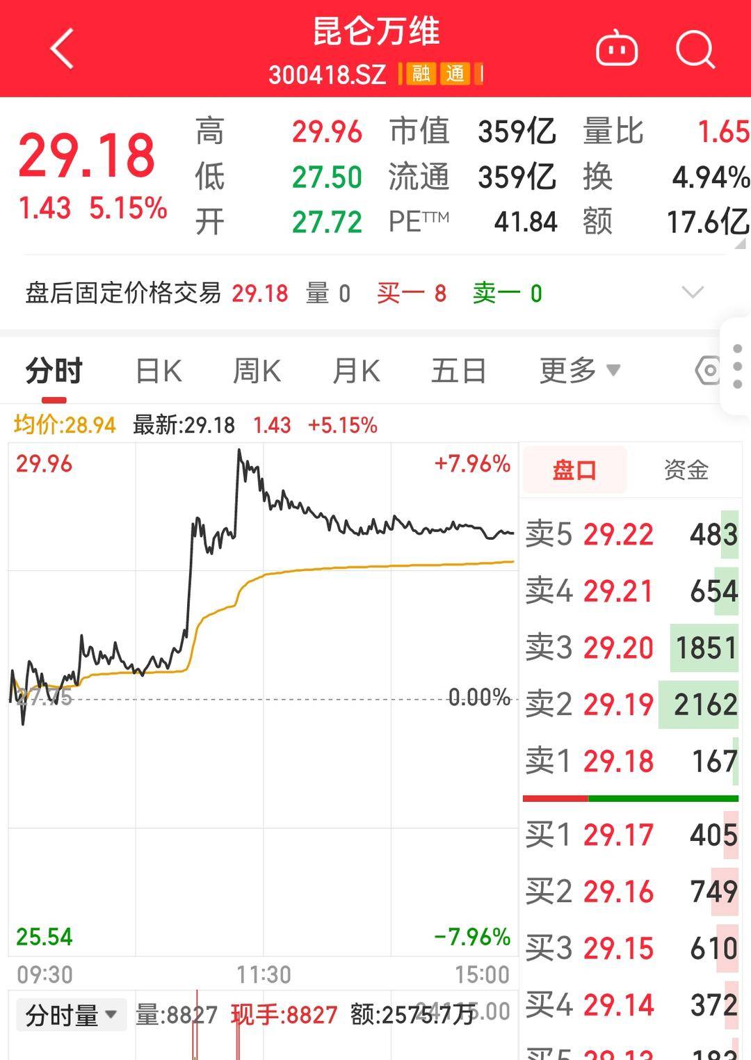 8月19日,A股上市公司昆仑万维股价收于29.18元/股,涨幅5.15%。