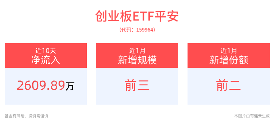 规模方面,创业板ETF平安近1月规模增长1380.57万元,实现显著增长,新增规模位居可比基金3/15。份额方面,创业板ETF平安近1月份额增长2600.00万份,实现显著增长,新增份额位居可比基金2/15。资金流入方面,创业板ETF平安近10个交易日内,合计“吸金”2609.89万元。