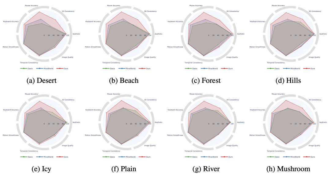 在GameWorld Score评测系统中,Matrix-Game在视觉质量、时间一致性、动作可控性与物理规则理解四大维度上均取得领先成绩,全面超越现有开源基线模型 Oasis 与 MineWorld。