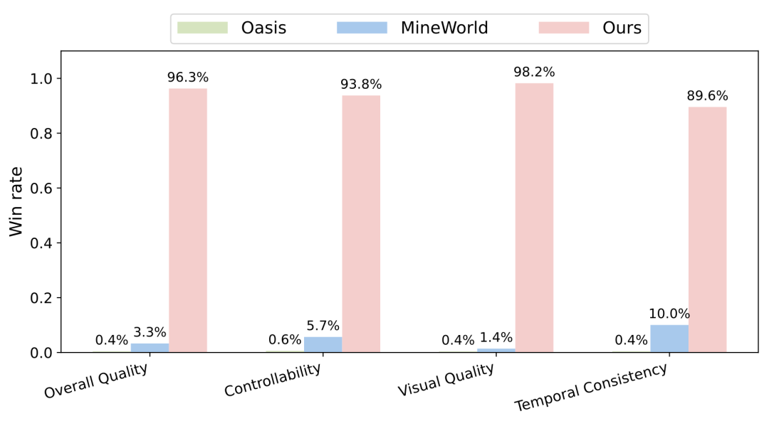 在双盲人评实验中,用户更倾向于选择 Matrix-Game生成的视频: