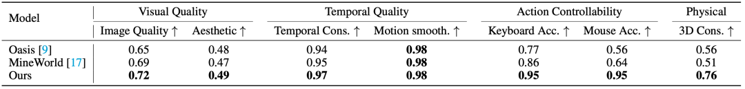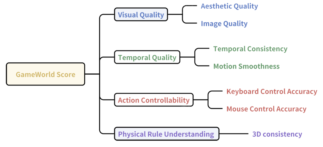 GameWorld Score评测体系:提出统一的游戏交互世界评估标准,从视频的视觉质量、时序质量、动作可控性与物理规则理解四个维度,全面量化模型性能,填补了该领域缺乏系统性评测基准的空白。