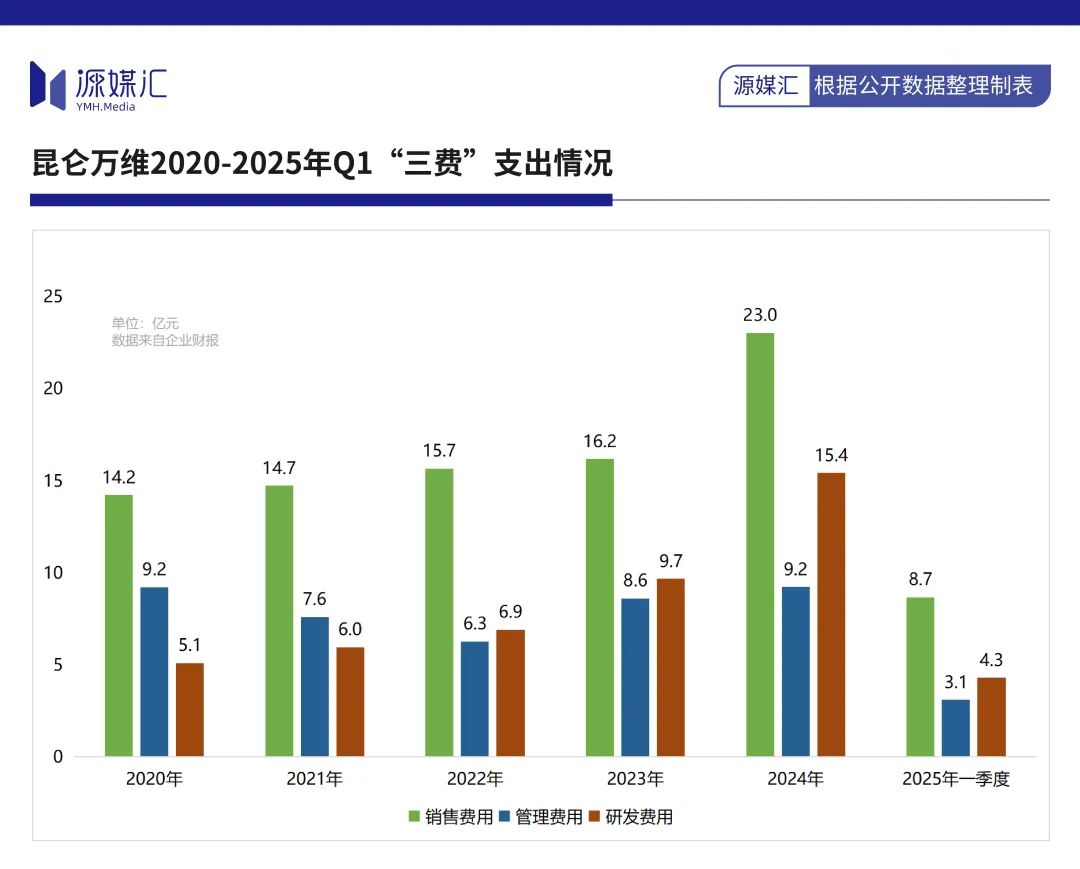 营收增长依赖巨额渠道投放,这反而成为公司重要亏损源头。2025年一季度,昆仑万维销售费用同比增长92%至8.68亿元,系对AI软件技术业务和短剧业务的市场推广费及充值渠道手续费增加所致。