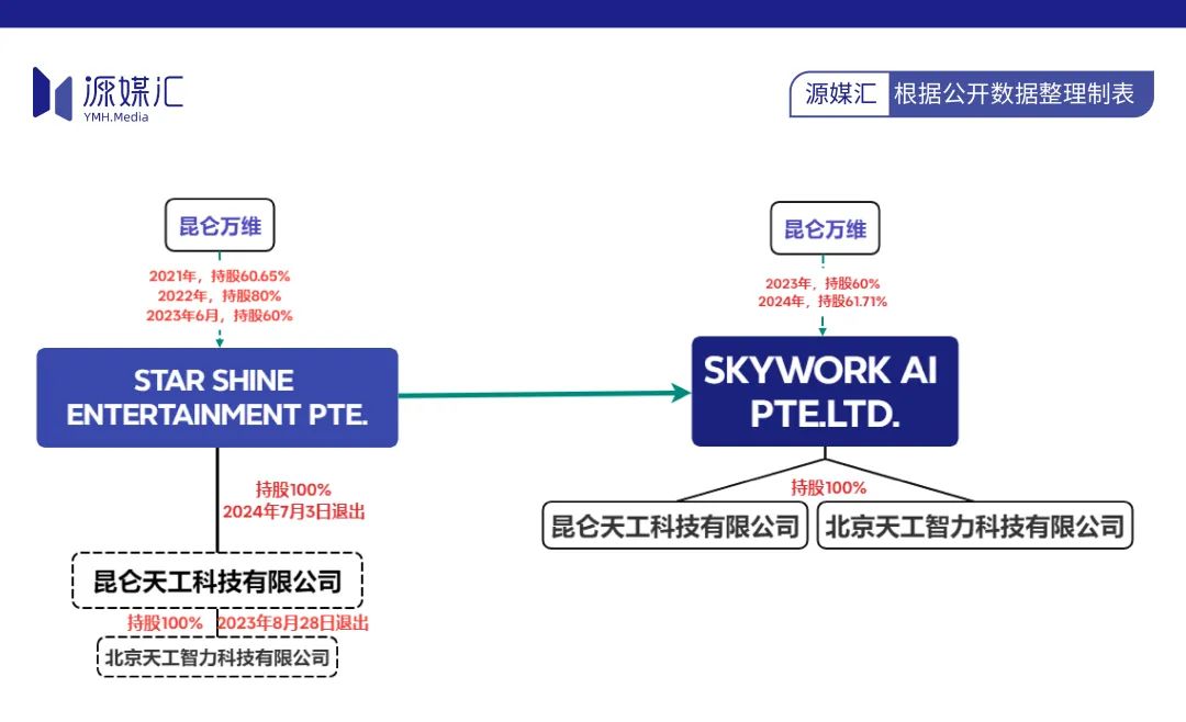 期内,北京天工、昆仑天工悄悄进行了股权腾挪。2023年8月、2024年7月,北京天工、昆仑天工由原股东Star Shine Entertainment Pte.Ltd.(下称“Star Shine”)转入到Skywork AI旗下,两者变更为兄弟公司。