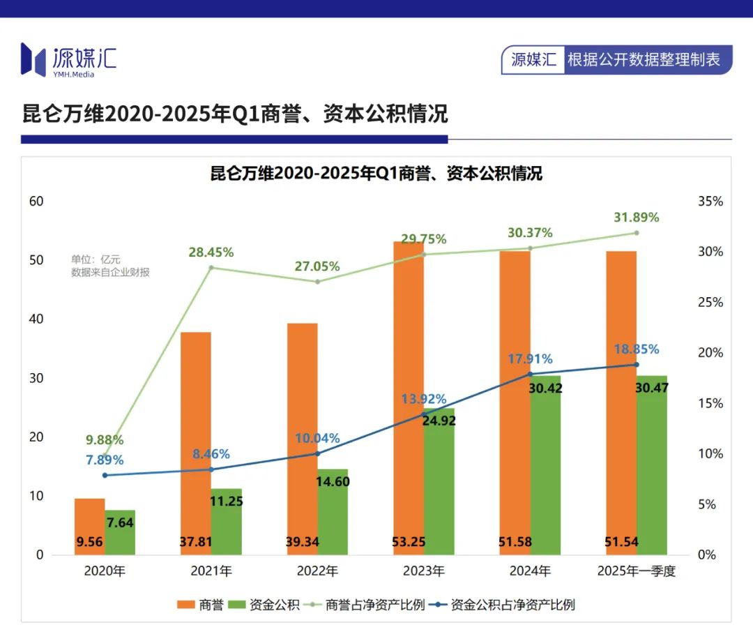 但是,多次交易带来的沉重负担转移到了昆仑万维身上,公司商誉、资本公积迎来爆发式上涨。其中,商誉从2020年的9.6亿元增长至2025年一季度的51.5亿元,占净资产比例从9.9%上涨至31.9%;同期,资本公积从7.6亿元增至30.5亿元,占净资产比例从7.9%上涨至18.9%。