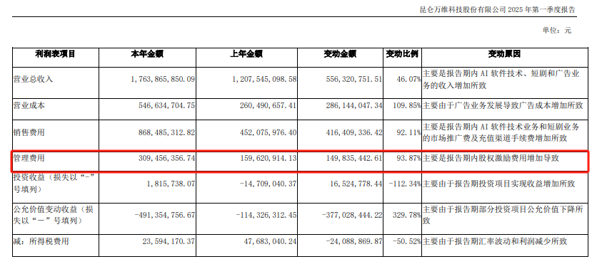 当前,昆仑万维“All in AI”经营策略也是如此,另一个重要亏损点就是:股权激励金额大幅度上涨。2025年一季度,昆仑万维管理费用翻了近一倍至3.1亿元,系期内股权激励费用增加;而2024年公司股权激励费用为4.9亿元,同比增长55.4%。