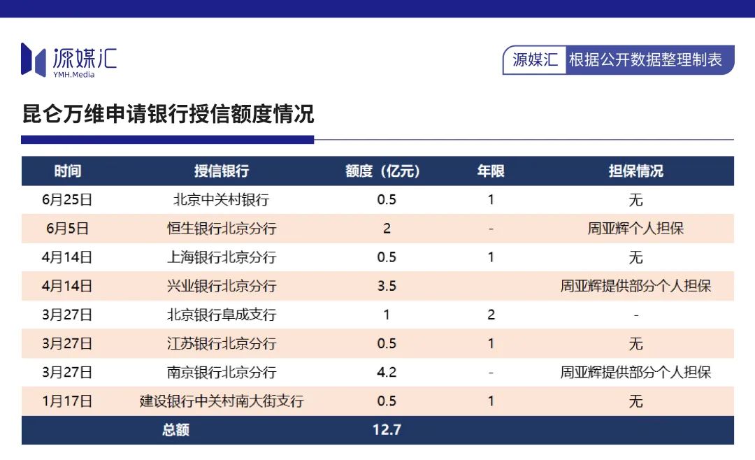 源媒汇初步统计,2025年年初至今,昆仑万维共申请8次银行授信额度,合计金额为12.7亿元。其中部分授信由控股股东周亚辉提供个人担保,申请理由基本为:经营发展需要。