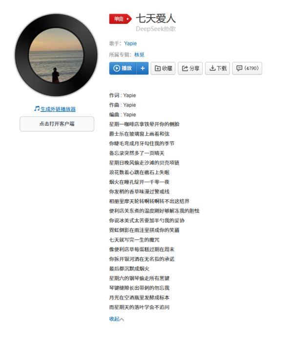 运用类似Mureka的AI工具来创作音乐并成功投入商业化运营的案例早已出现,最为典型的歌曲便是《七天爱人》。这首由博主Yapie用AI创作而成,据称其模仿周杰伦曲风,围绕“七日爱情周期”展开创作,仅用2小时就完成了作词、编曲和演唱。此后,该歌曲在抖音、网易云音乐等平台爆红,登上网络热歌榜,为创作者带来了数万元版权收益,其版权已被卖出,发布后播放量迅速突破20万次。