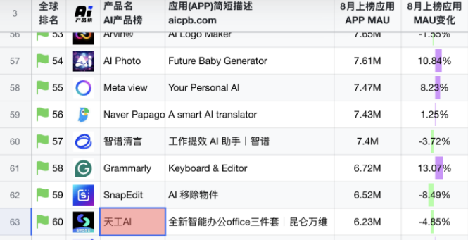 2025年以来,AI产品的整体格局已经显露出“强者恒强”的趋势。量子位智库的数据显示,豆包、夸克、DeepSeek在Web和APP双端均表现出垄断式的领先优势,已成为首批国民级AI应用。公众号“AI产品榜”发布的8月榜单数据显示,在APP端,天工AI以623万月活位列全球第六十名、国内第十二名,其MAU环比下降4.85%。
