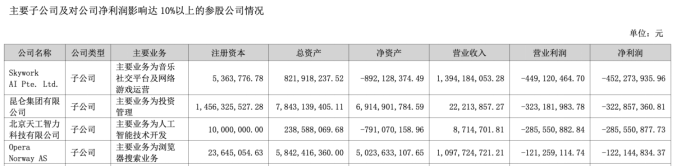 除昆仑集团之外,昆仑万维旗下还有3家子公司处于亏损状态,分别为北京天工智力、SkyworkAI Pte. Ltd.以及OperaNorway AS,分别负责人工智能技术开发、音乐社交平台及网络游戏运营、浏览器搜索业务。2025年上半年,上述三家子公司净亏损金额分别为2.86亿元、4.52亿元、1.22亿元。