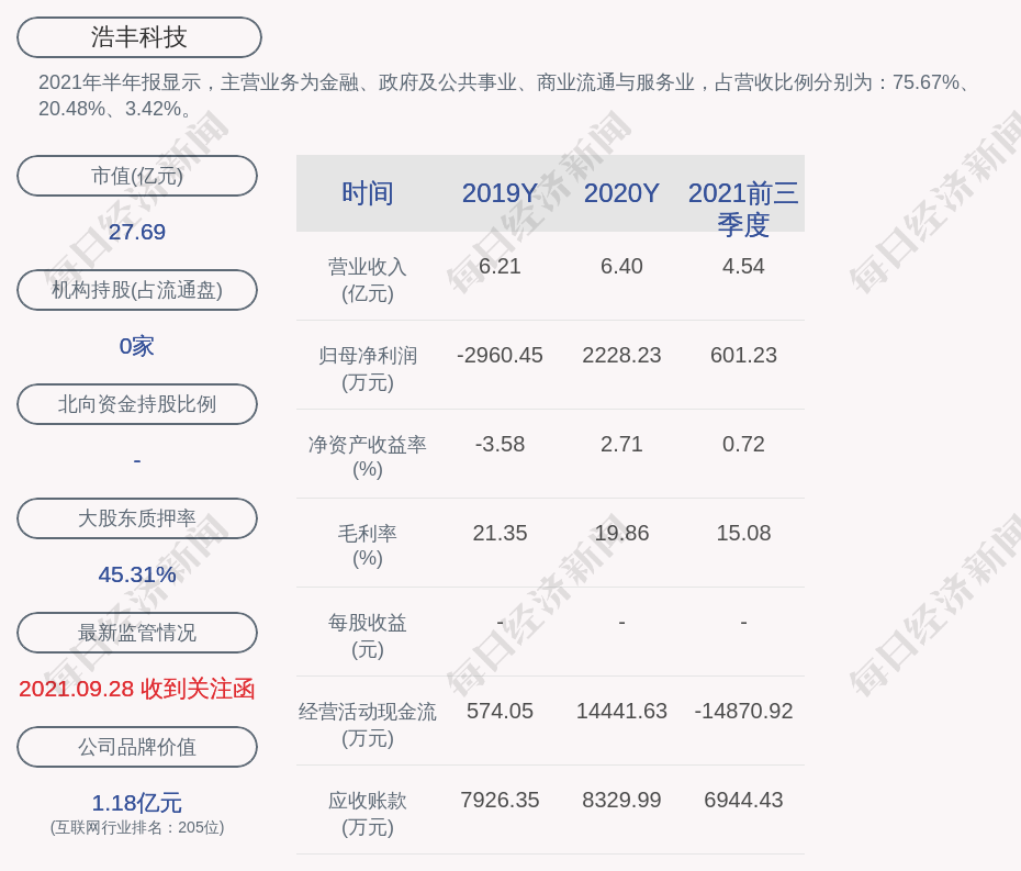 2021年半年报显示,浩丰科技的主营业务为金融、政府及公共事业、商业流通与服务业,占营收比例分别为:75.67%、20.48%、3.42%。