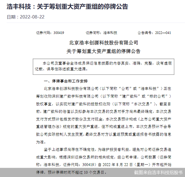 浩丰科技(300419)又要并购资产。8月22日,浩丰科技对外披露筹划重大资产重组停牌公告称,公司正在筹划收购深圳建广数字科技有限公司(以下简称“建广数科”)股权事宜,以实现对建广数科的控股权收购,公司股票自8月22日起停牌。北京商报记者注意到,浩丰科技新主王广宇去年11月底刚成为公司实控人,这已是其入主后的第二次并购计划。