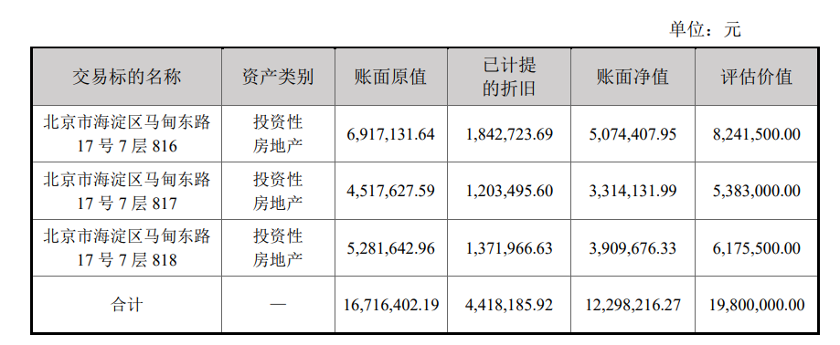 三套房产的类别均为投资性房地产,816室的账面原值为691.71万元,账面净值为507.44万元,已计提折旧184.27万元,评估价值为824.15万元。817室的账面原值为451.76万元,账面净值为331.41万元,已计提折旧120.35万元,评估价值为538.3万元。818室的账面原值为528.16万元,账面净值为390.97万元,已计提折旧137.2万元,评估价值为617.55万元。