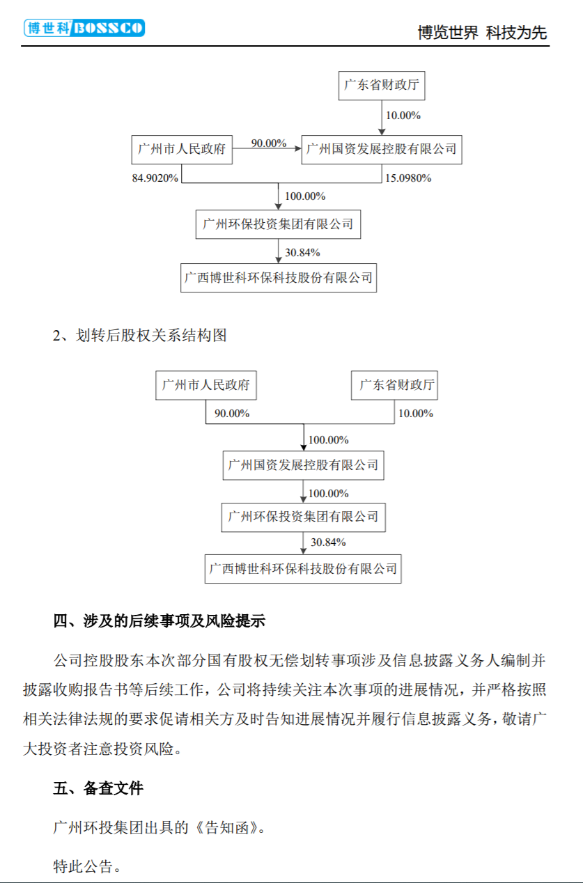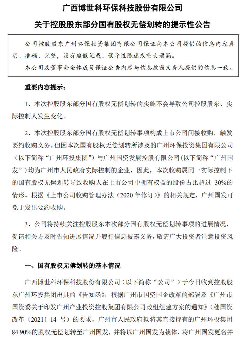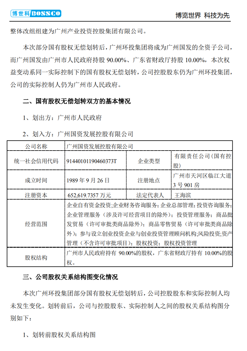 博世科公告,控股股东广州环投集团出具的《告知函》,广州市人民政府拟将其直接持有的广州环投集团84.9%的股权无偿划转至广州国发,并将以广州国发为载体,将广州国发更名并整体改组组建为广州产业投资控股集团有限公司。