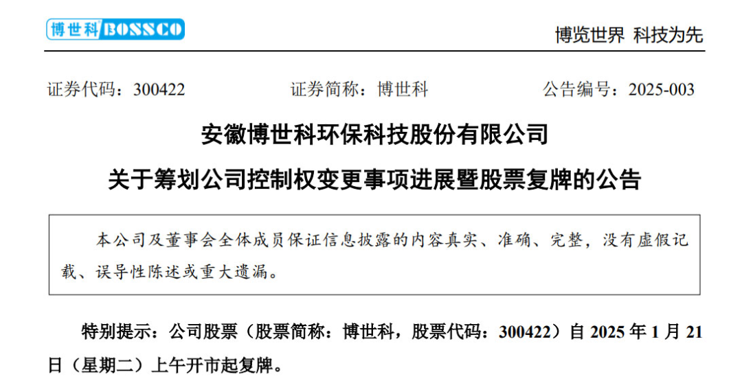 2025年1月13日,博世科发布公告称,公司控股股东宁国市国有资本控股集团有限公司(下称“宁国国控”)正筹划重大事项,可能导致公司控股股东及实际控制人发生变更。