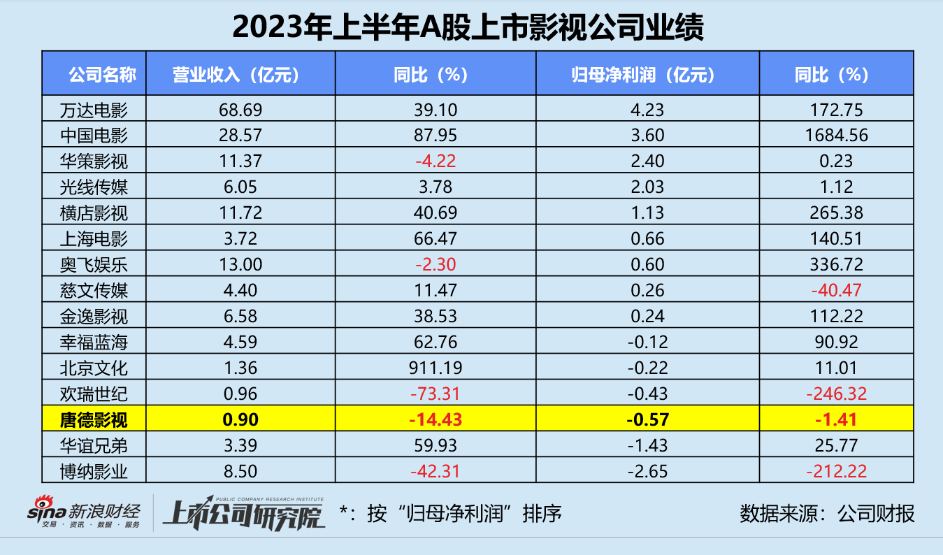8月30日,唐德影视(下文简称:唐德)公布2023年上半年业绩报告。财报数据显示,报告期内,公司实现总营收8984.53万元,同比下滑14.43%,在15家A股上市的影视公司中垫底。归母净亏损录得5821.28万元,较2022年同期微降1.41%。重金押注的历史题材剧《巴清传》因范冰冰、高云翔等主演接连触碰红线,播出时间遥遥无期,唐德一度行至退市边缘。2018-2020年公司元气大伤,三年累计亏损11.13亿元。