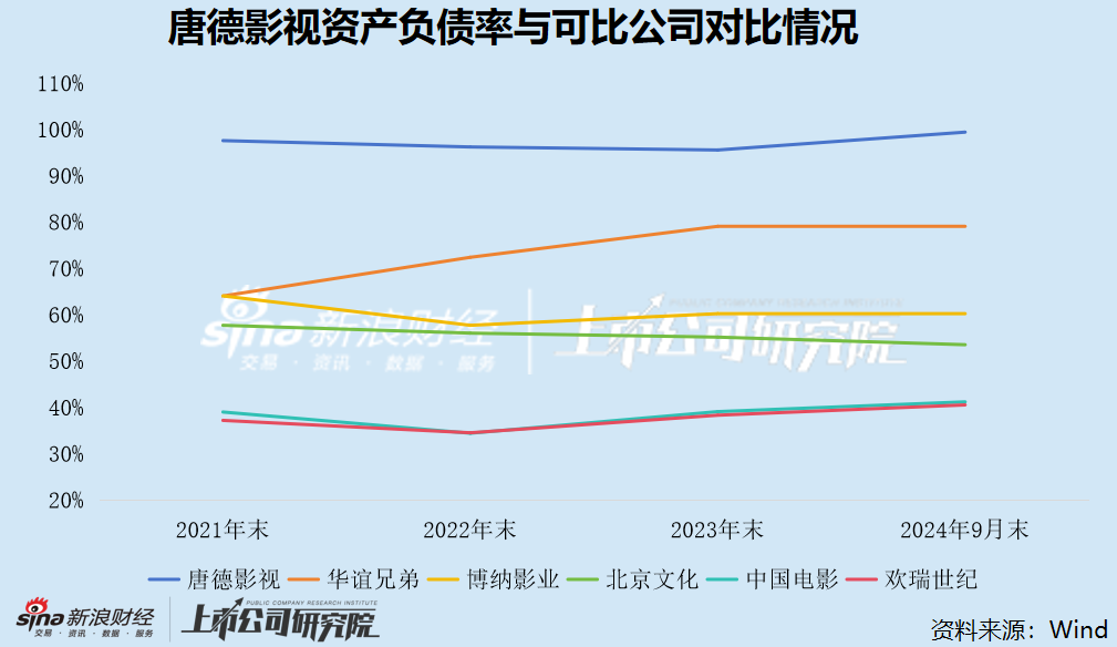 资本结构方面,报告期内,公司资产负债率分别为97.55%、96.18%、95.52%、99.38%,始终维持在95%以上,2024年9月末已逼近100%,财务风险畸高;同期,行业均值为37.49%、36.98%、36.22%、36.05%。公司负债水平遥遥领先于影视同行,比排名第二的华谊兄弟也高出近20个百分点。