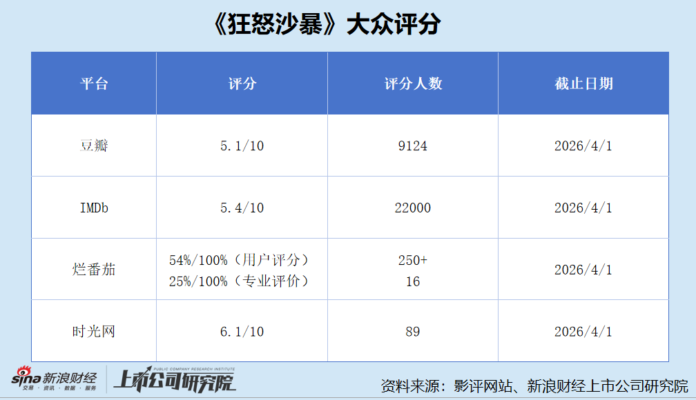 2025年10月,《狂怒沙暴》官方微博宣布影片定档同年12月上映,然而时至今日,该片仍未登陆内地大银幕。频繁跳票背后,该片在全球范围内收获了一致差评,IMDb评分5.4,豆瓣评分5.1,而烂番茄上仅有约25%的专业影评人给出了正面评价。即便未来能成功在内地上映,其票房表现恐怕也不太乐观。