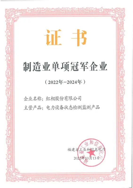 此次获评“福建省制造业单项冠军企业”,是对红相股份多年来在深耕专业领域的极大肯定。未来,红相股份还将持续提升自主创新能力,促进公司高质量发展。