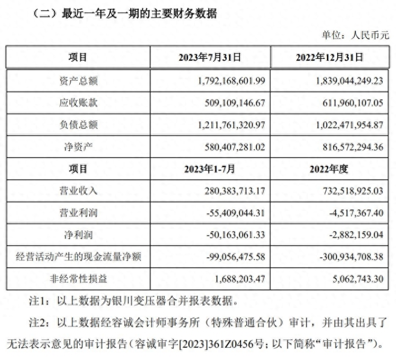 值得一提的是,银川变压器的2022年及2023年1-7月的财务报表被出具了无法表示意见的审计报告。