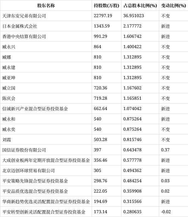 半年报显示,2022年上半年末的公司十大流通股东中,新进股东为日本金属株式会社、香港中央结算有限公司、信诚新兴产业混合型证券投资基金、臧永和、大成创业板两年定期开放混合型证券投资基金、北京迈创环球贸易有限公司、华商新趋势优选灵活配置混合型证券投资基金,取代了一季度末的减永和、南方天成-南方天辰景晟20期私募证券投资基金、中国银行股份有限公司一易方达资源行业混合型证券投资基金、北京清和泉资本管理有限公司一清和泉成长2期证券投资基金、南方天辰景丞价值精选2期私募证券投资基金、中国对外经济贸易信托有限公司一外贸信托一清和泉慧益证券投资集合资金信托计划、嘉实主题新动力混合型证券投资基金。在具体持股比例上,国信证券股份有限公司、平安策略先锋混合型证券投资基金、平安品质优选混合型证券投资基金持股有所上升,平安转型创新灵活配置混合型证券投资基金持股有所下降。