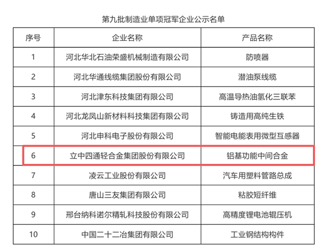 近日,工业和信息化部正式公布第九批国家级制造业单项冠军企业名单,立中四通轻合金集团股份有限公司(以下简称“ 立中集团 ”)凭借其核心产品——“铝基功能中间合金”成功入选,成为中国制造业细分领域的又一标杆企业。