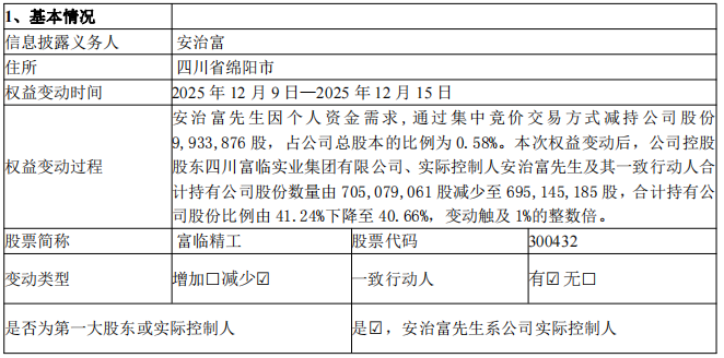 富临精工 (300432.SZ)昨晚披露关于控股股东、实际控制人及其一致行动人权益变动触及1%整数倍的公告称,公司于2025年11月17日披露了《关于实际控制人减持股份的预披露公告》,公司实际控制人安治富计划自上述公告披露之日起十五个交易日后的三个月内,以集中竞价交易方式减持公司股份累计不超过17,097,602股(占本公司总股本比例1.00%)。