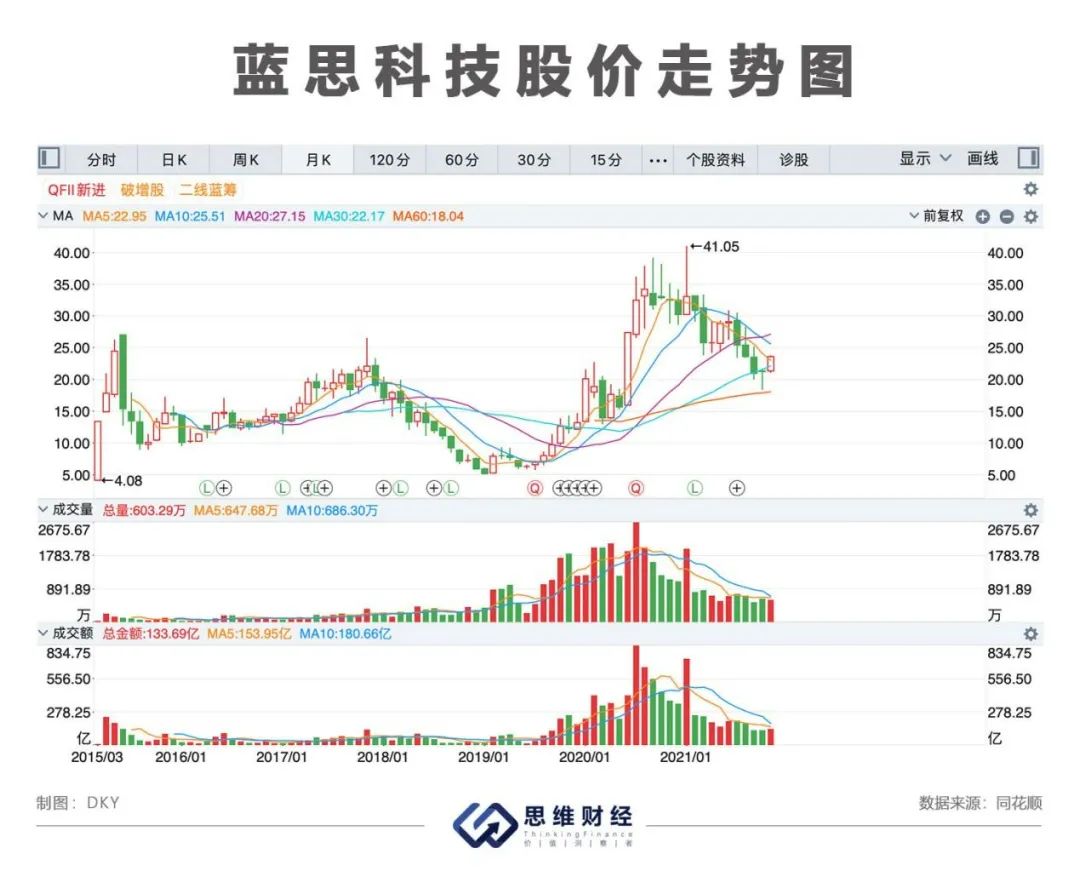 据央视新闻报道,2015年,蓝思科技因加入苹果产业链赚得盆满钵满,曾有超过一半的营收与此相关。2020年财报显示,蓝思科技第一大客户(苹果)贡献了203.06亿销售额,占整体销售额54.97%。靠“吃”苹果长大的蓝思科技,受益于苹果供应链,其股价在今年1月时达到顶峰,最高为41.05元/股,然而伴随业绩下滑,蓝思科技的股价也步入调整通道。