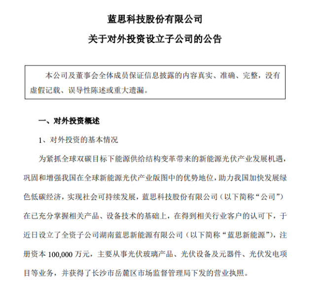 不仅如此,11月4日,蓝思科技对外发布公告称,公司设立了全资子公司湖南蓝思新能源有限公司(下称“蓝思新能源”),蓝思新能源主要进军新能源光伏领域,其主营业务为光伏玻璃产品、光伏设备及元器件、光伏发电项目等业务,注册资本10亿元。