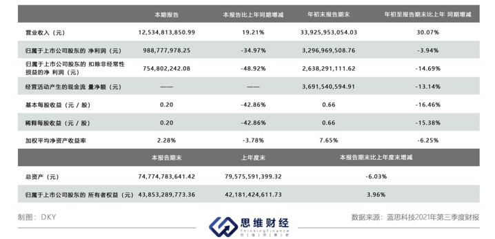 蓝思科技三季报显示,今年前三季度实现营业收入339.26亿元,同比提升30.07%;归属于上市公司股东的净利润32.97亿元,同比微降3.94%;其中,第三季度蓝思科技营收为125.35亿元,同比增长19.21%;归属于上市公司股东的净利润为9.89亿元,同比下降34.97%。面对第三季度利润大幅同比下降的情况,蓝思科技解释称,主要是由于消费电子与新能源汽车行业的芯片供需情况进一步失衡等原因影响。